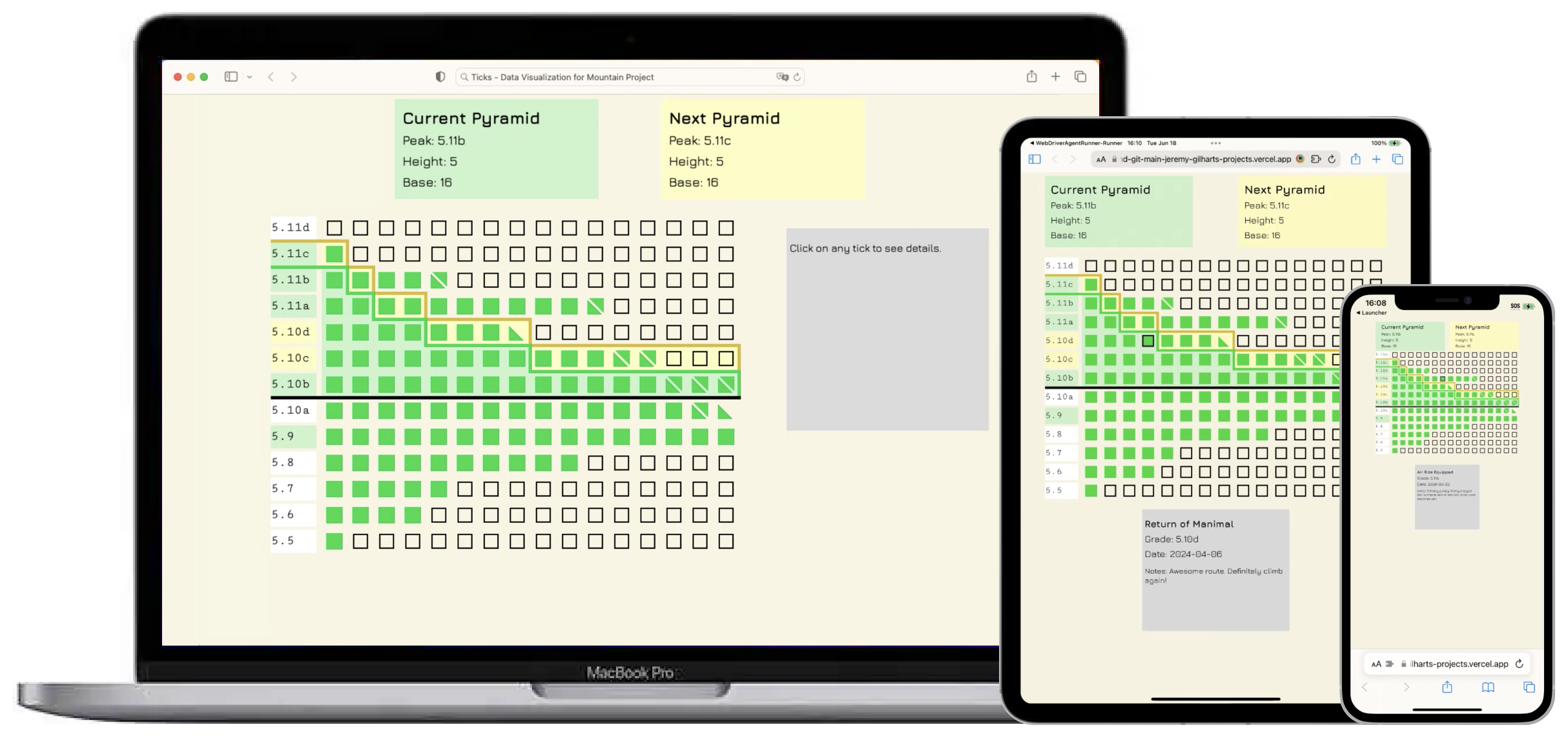 This app integrates with Mountain Project® (a digitial guidebook/ location based climb tracker) to analyze logged outdoor climbing progress. This app calculates the user's current best climbing-pyramid and recommends climbing grades to expand one's pyramid. Additionally, this data visualization tool allows any climber to see their progress over time. Tip: when viewing this project, use "JEREMY" as a placeholder url.